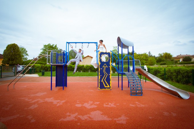 Beaucoup de rires au mariage de Céline et Romain, je crois que je n’avais jamais eu l’idée de faire grimper une mariée dans les jeux d’un jardin d’enfants!